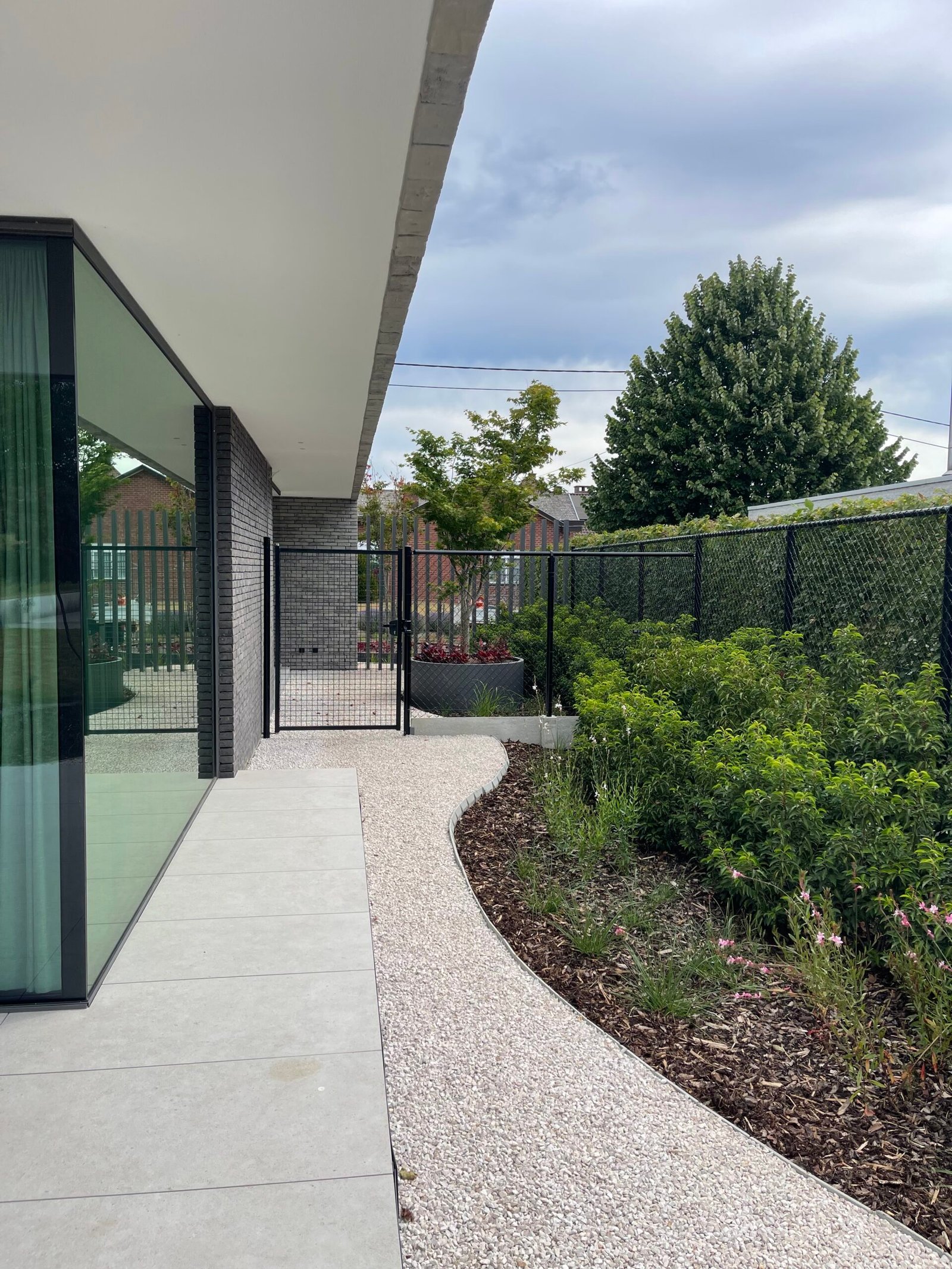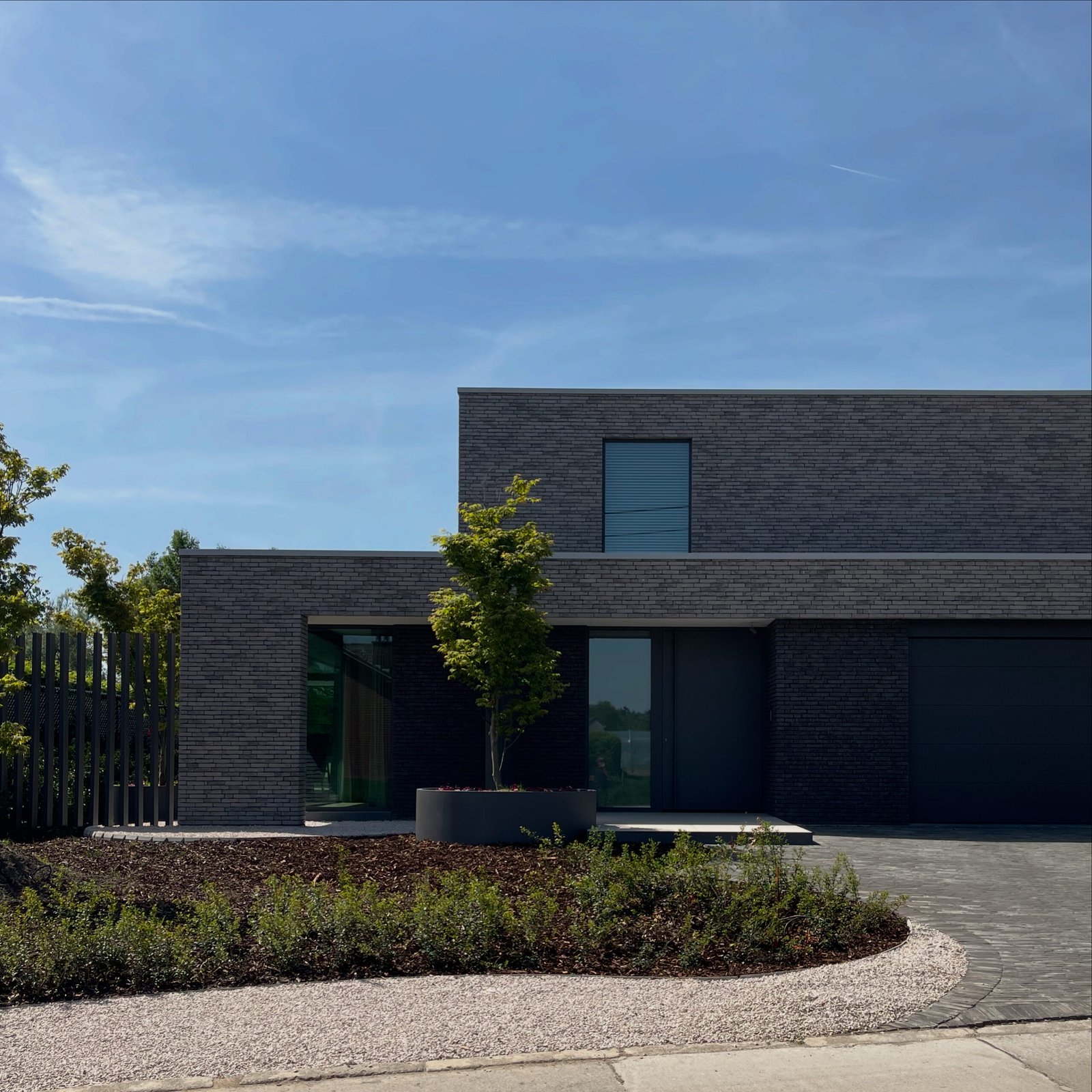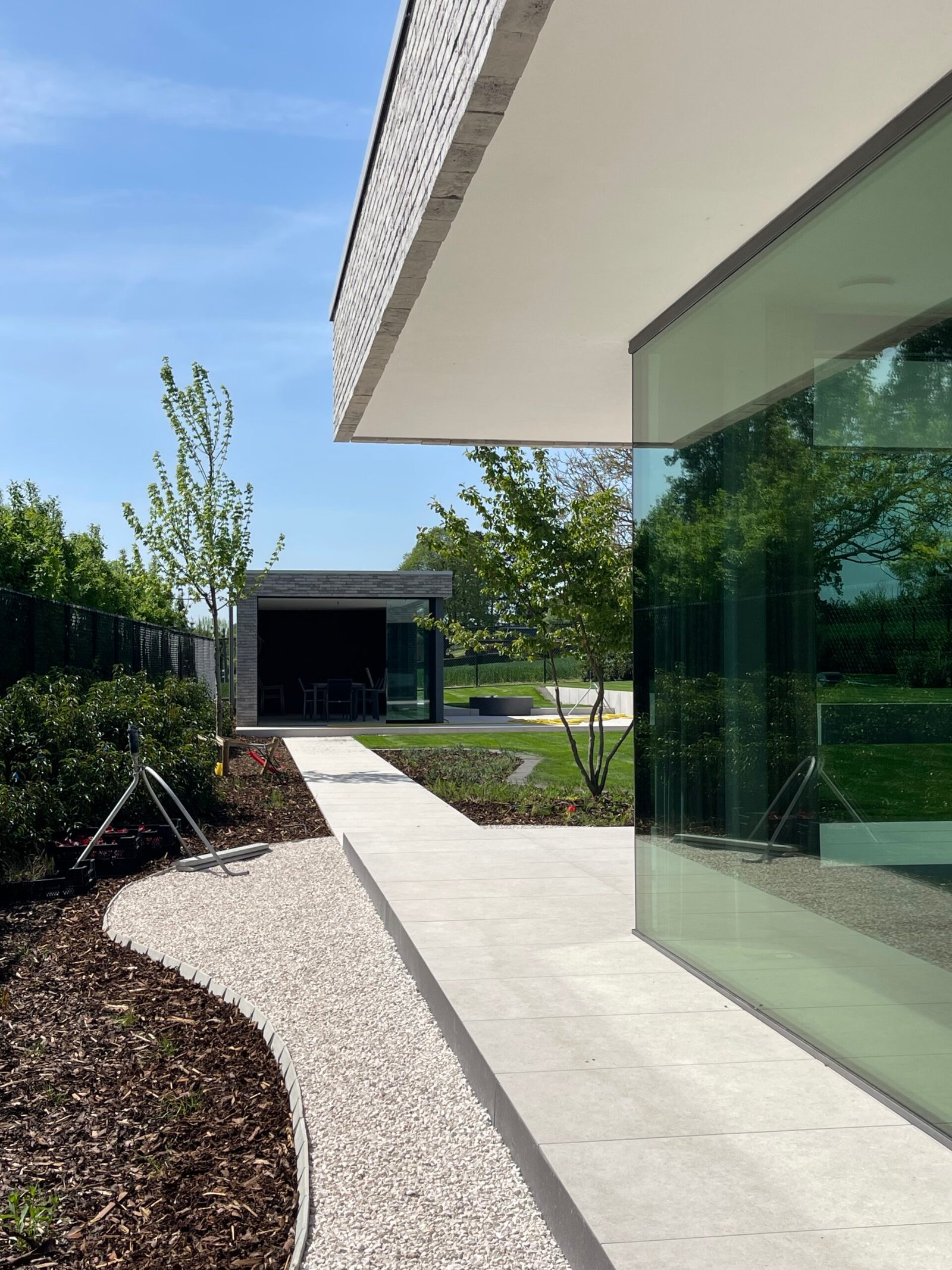Voor deze moderne woning in Bertem realiseerden we een strakke en doordachte tuinaanleg die mooi aansluit bij de architectuur. Aan de voorkant werkten we met klinkers voor een verzorgde en duurzame oprit, terwijl achteraan grote tegels zorgen voor een rustige, moderne uitstraling. De grote open graspartijen geven de tuin ruimte en versterken het open karakter. Achteraan vormt de tuinkamer een verlengstuk van de woning, een plek om het hele jaar door te genieten van het uitzicht op de tuin. Samen met de groene accenten en duidelijke lijnen vormt dit een harmonieus geheel van voor tot achter.