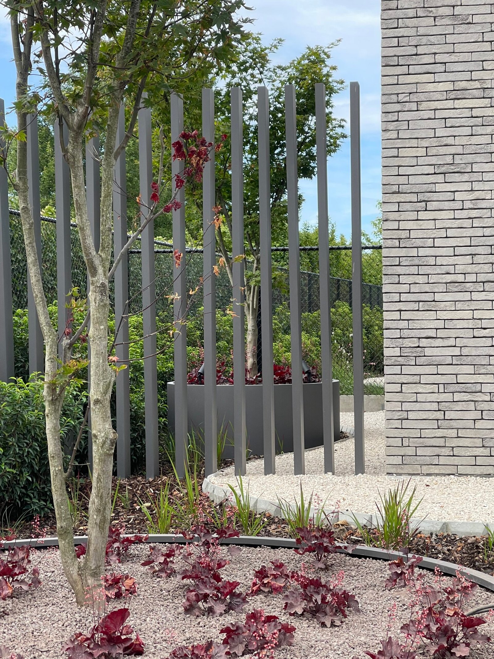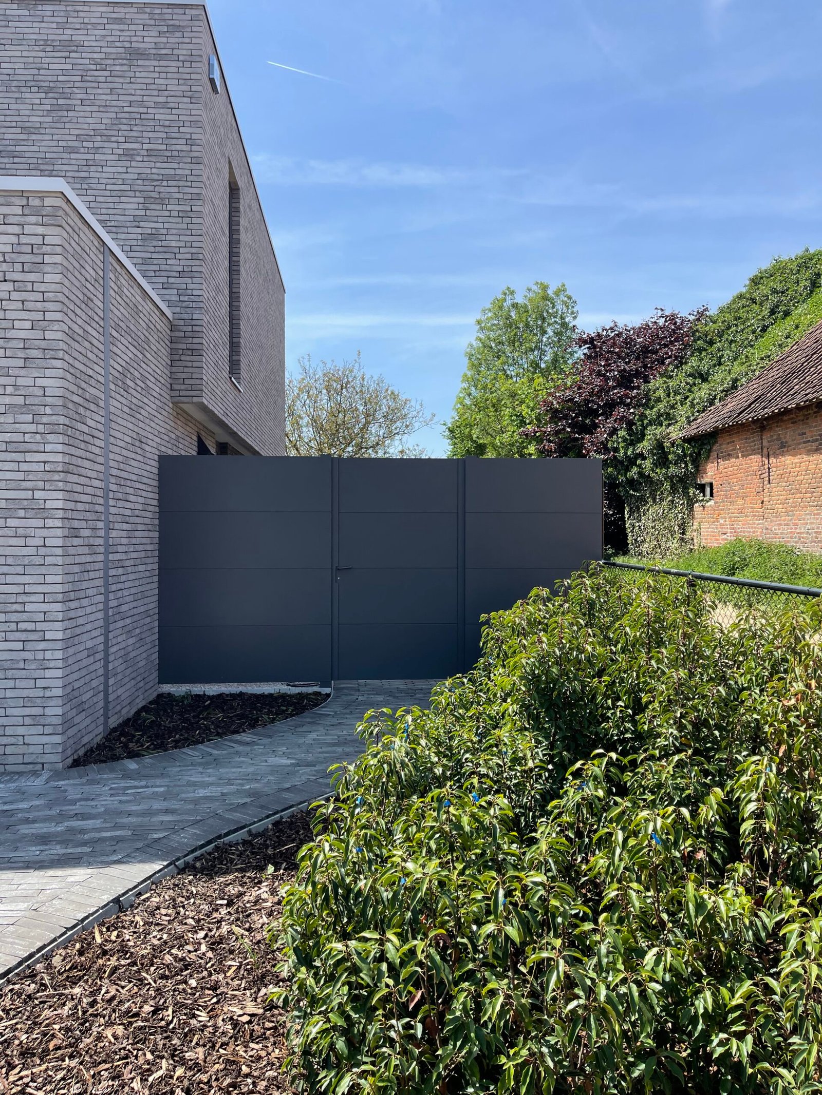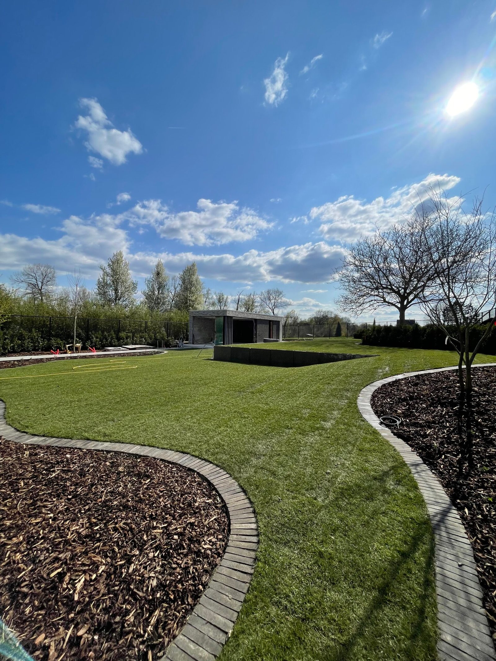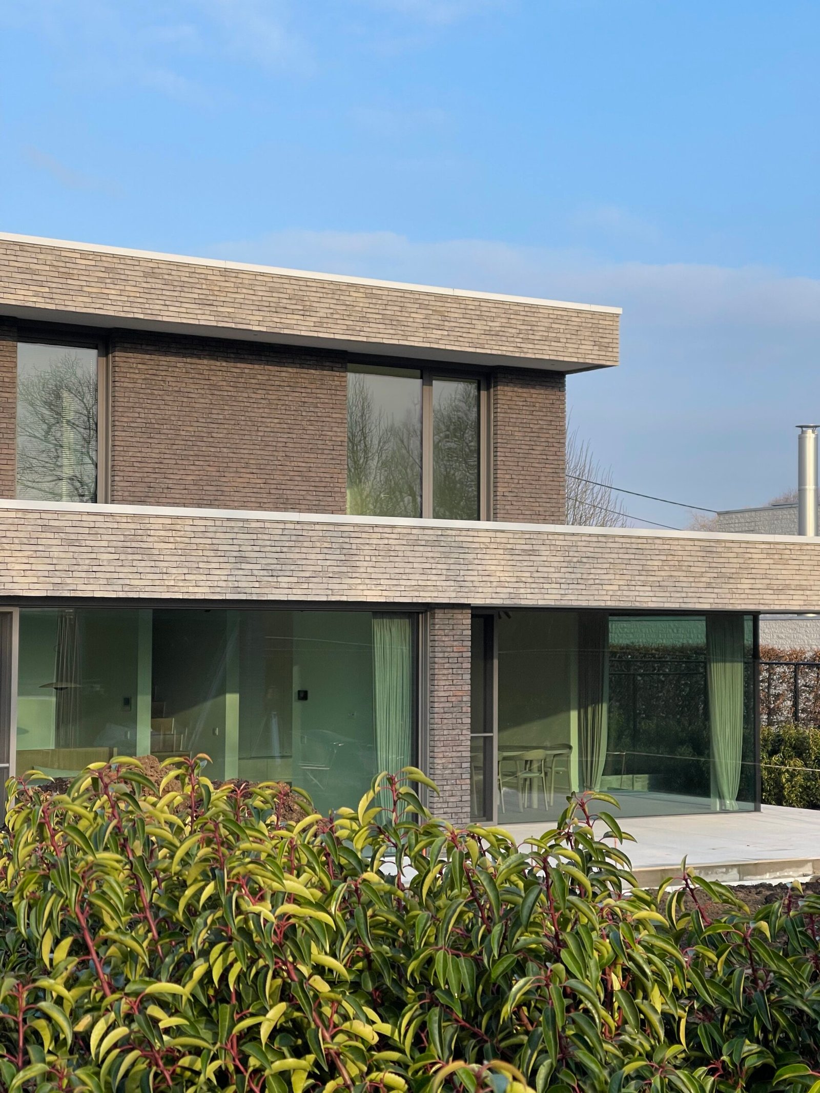 Voor deze moderne woning in Bertem realiseerden we een strakke en doordachte tuinaanleg die mooi aansluit bij de architectuur. Aan de voorkant werkten we met klinkers voor een verzorgde en duurzame oprit, terwijl achteraan grote tegels zorgen voor een rustige, moderne uitstraling. De grote open graspartijen geven de tuin ruimte en versterken het open karakter. Achteraan vormt de tuinkamer een verlengstuk van de woning, een plek om het hele jaar door te genieten van het uitzicht op de tuin. Samen met de groene accenten en duidelijke lijnen vormt dit een harmonieus geheel van voor tot achter.