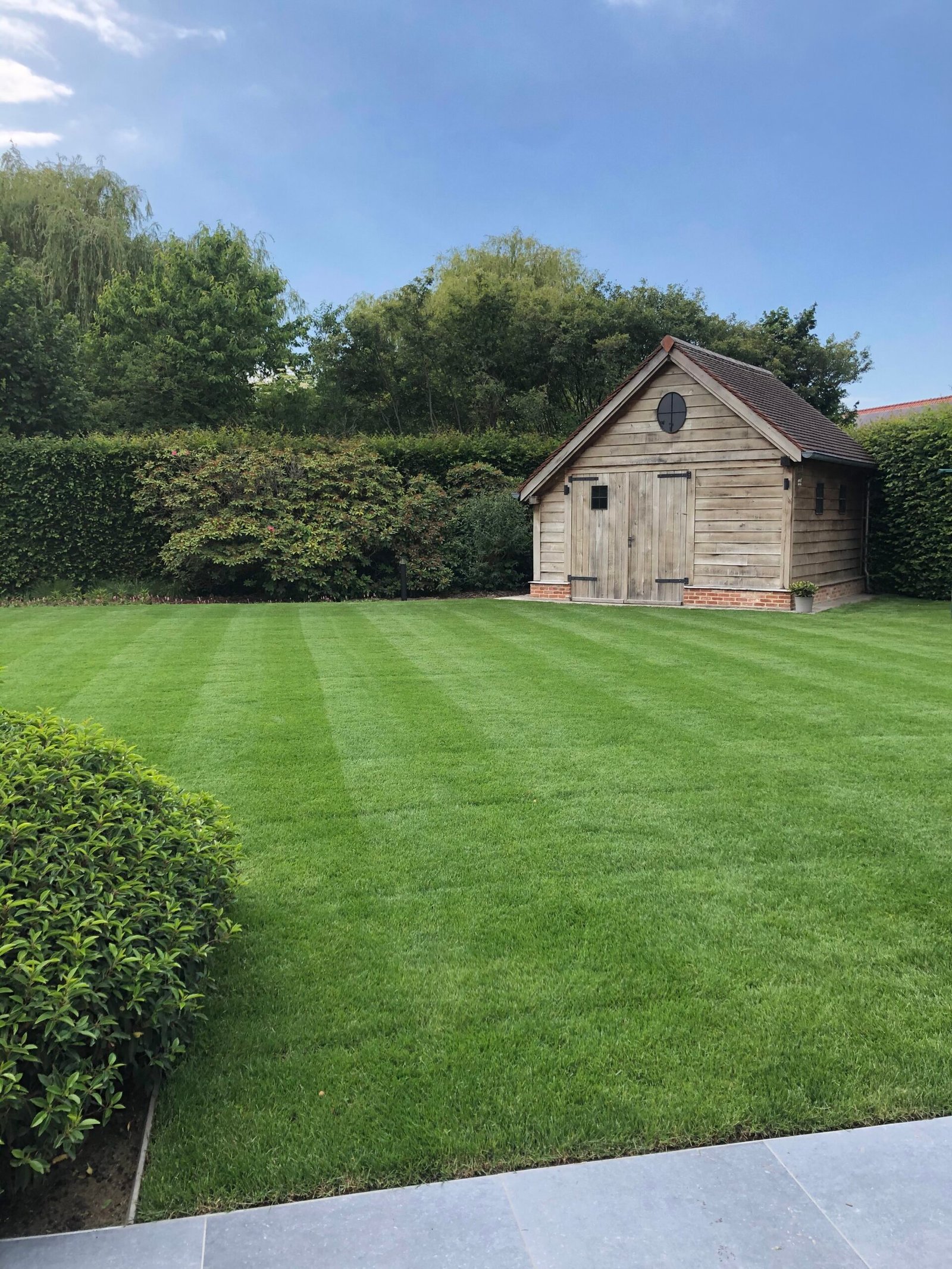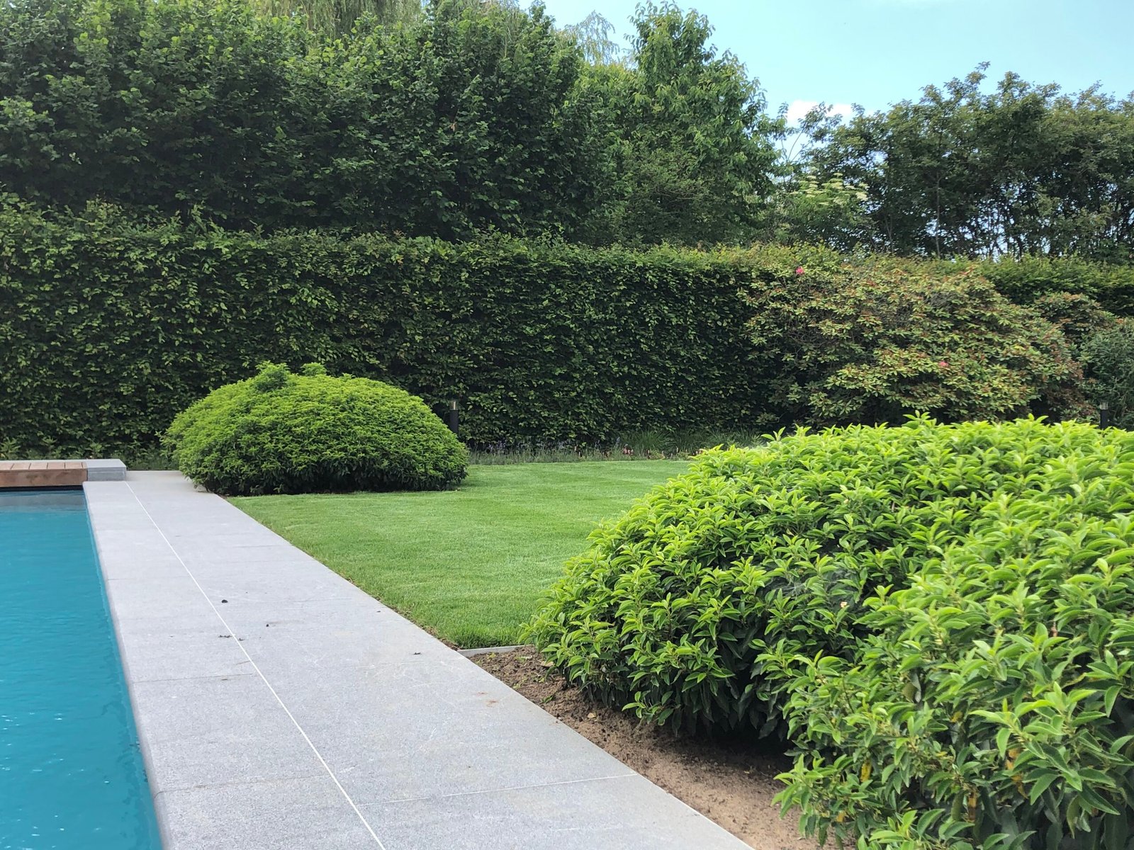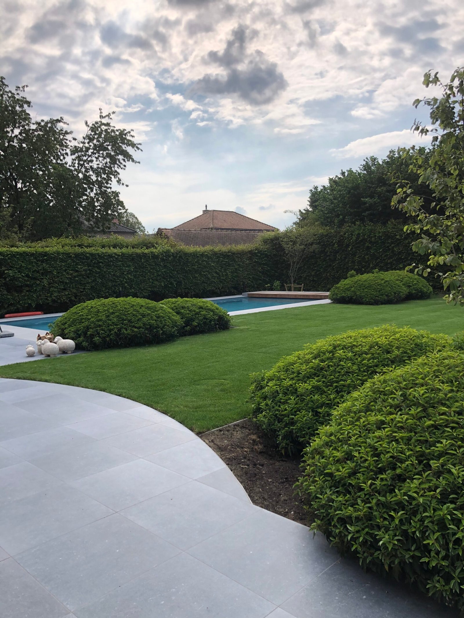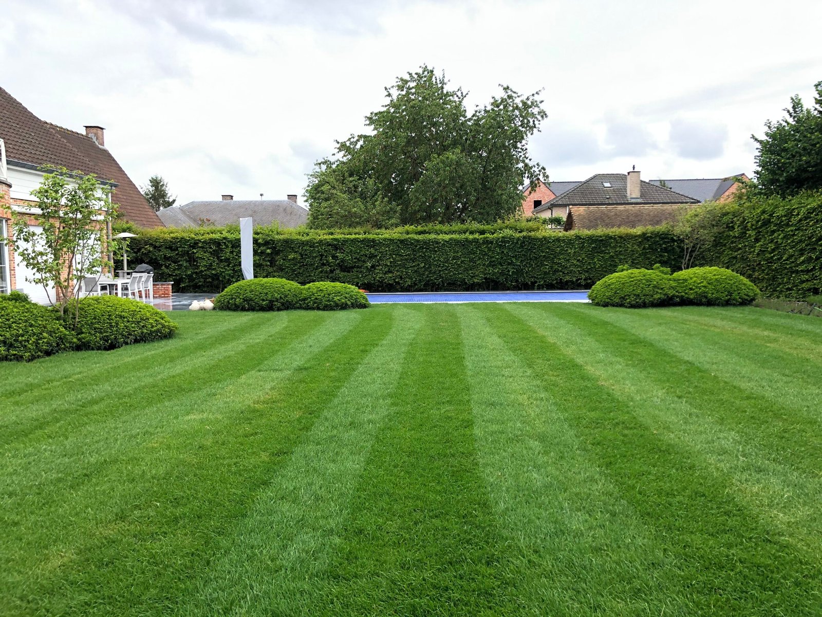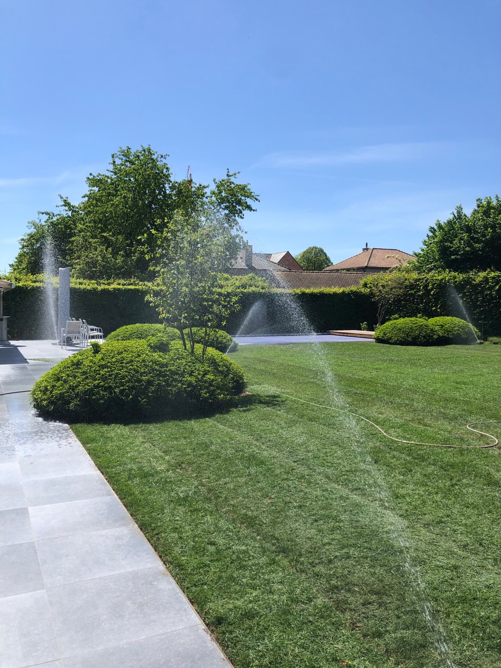 Voor deze tuinaanleg in Boortmeerbeek verzorgden we zowel het ontwerp als de volledige uitvoering. Het ruime gazon vormt de basis van de tuin en blijft dankzij het geïntegreerde sproeisysteem het hele jaar mooi groen.