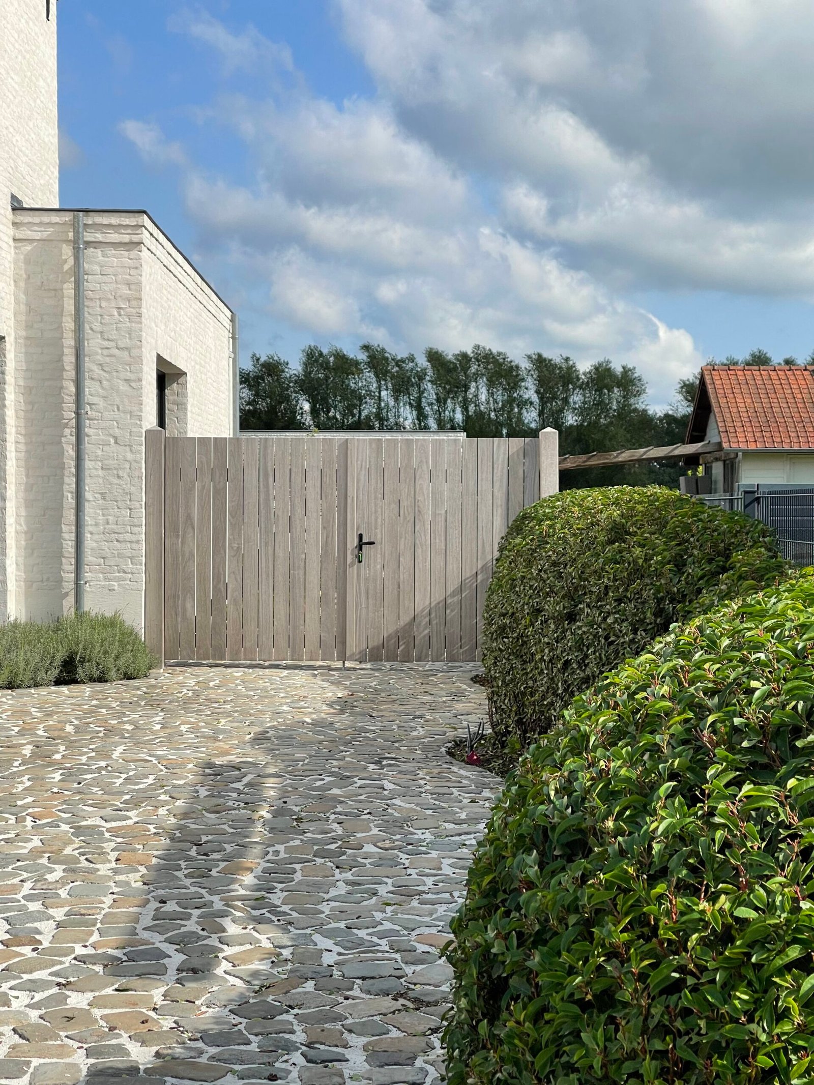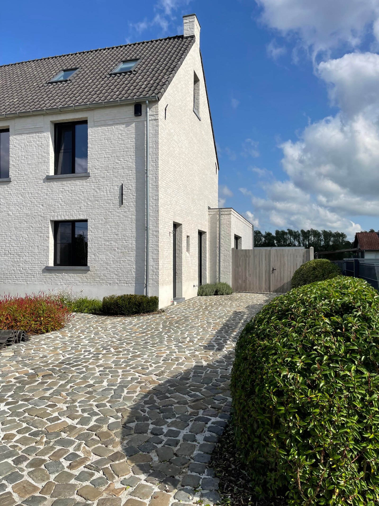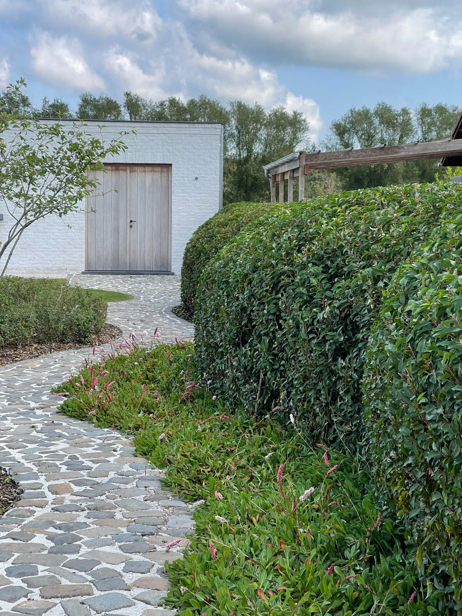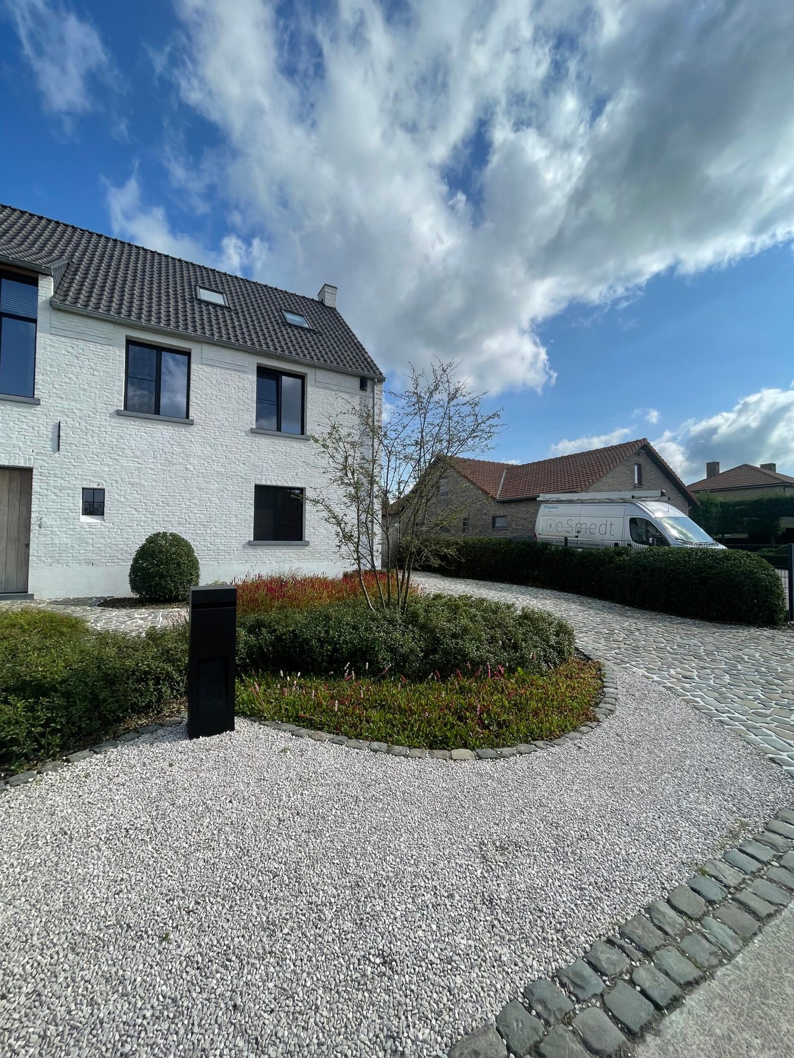 De tuinpaden en oprit werden uitgevoerd in kasseien, goed voor een authentieke en tijdloze uitstraling. Ook de plantvakken werkten we af met een kasseirand, waardoor alles één geheel vormt. Het grind brengt extra textuur en zorgt voor een zachte overgang tussen de verschillende zones.